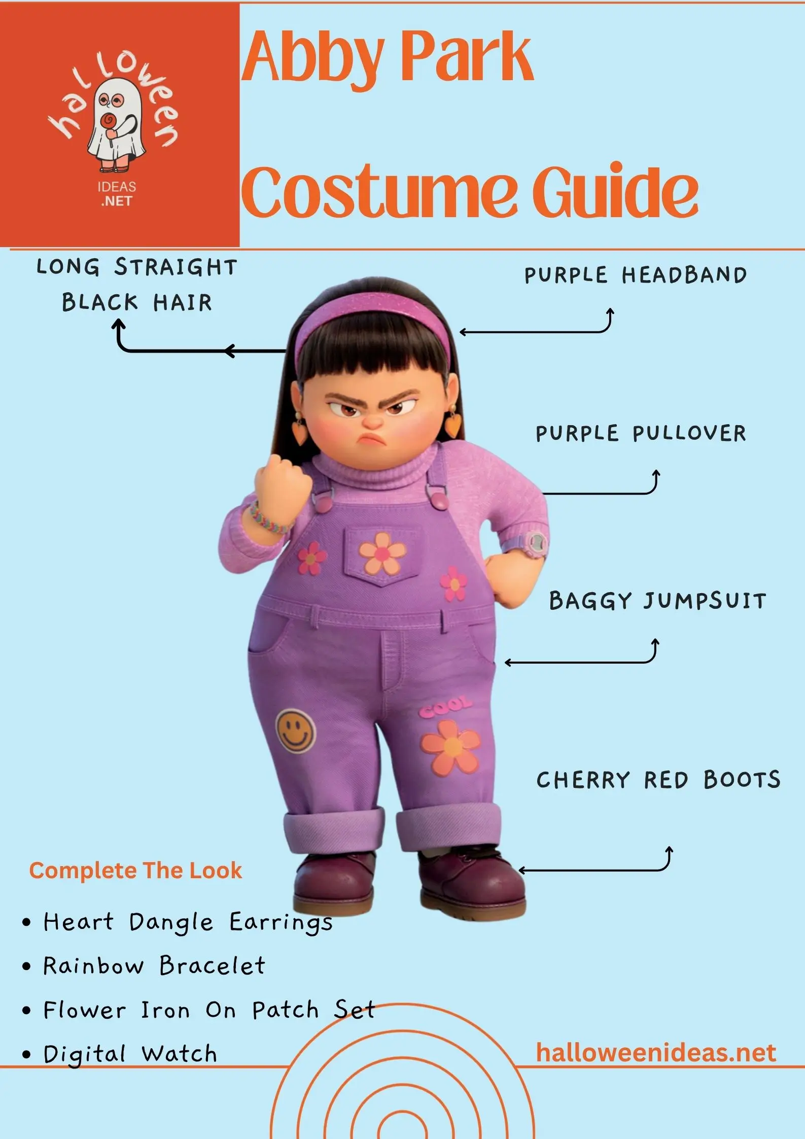 Abby Park: Purple pullover, matching baggy overalls, and cherry-red boots. Add a purple headband, heart earrings, and rainbow bracelet for her signature look.