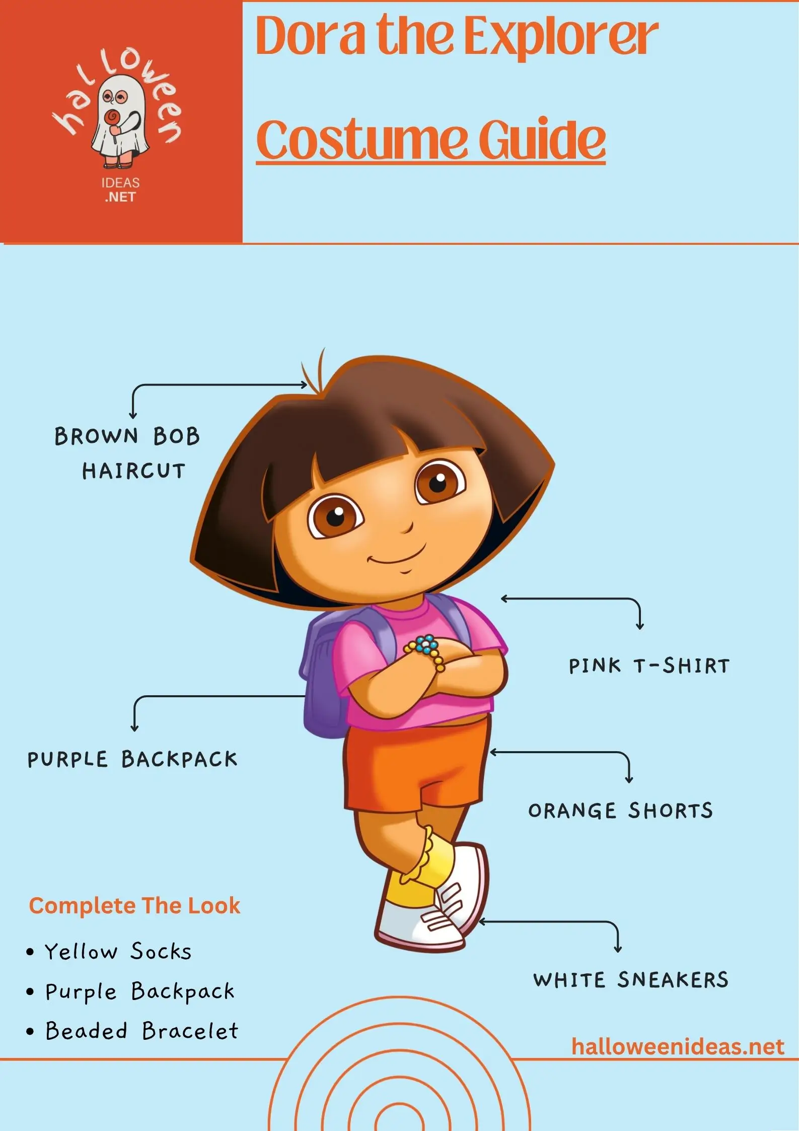 Hair: Dora’s look is simple and iconic — a short brown bob with straight bangs. A wig makes it instant, but you can also tuck longer hair under and pin it into a rounded shape.