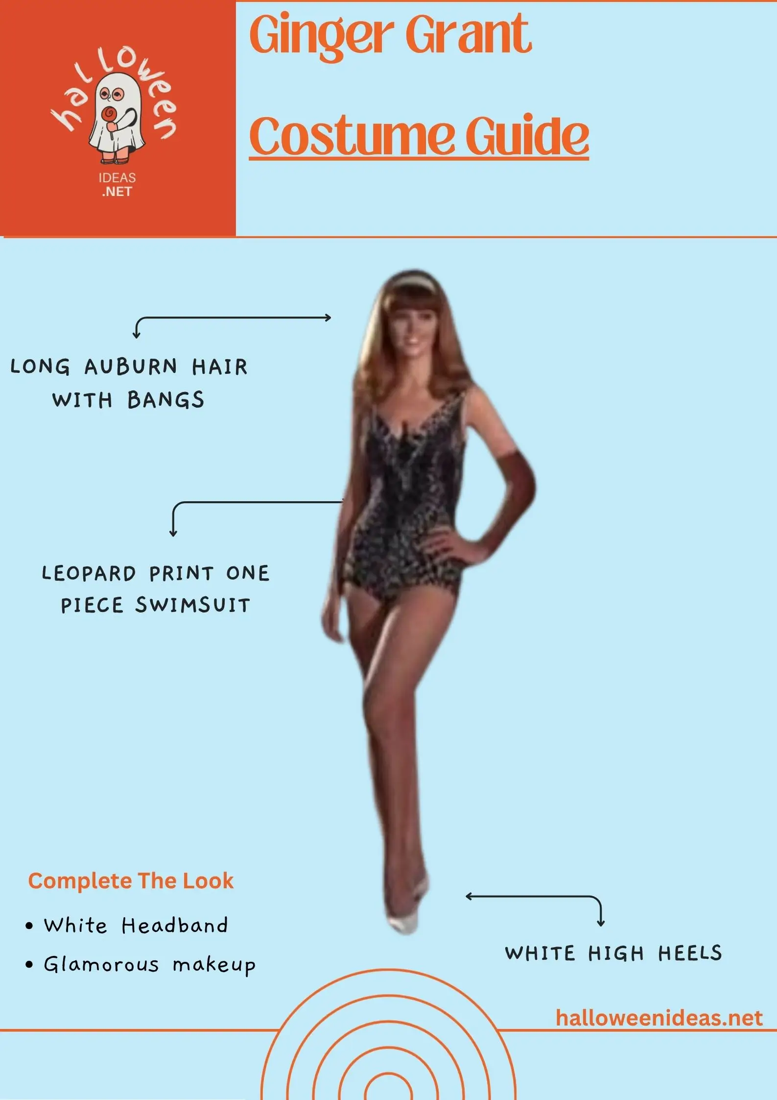 Ginger Grant: Leopard romper, white heels, and movie star aura.