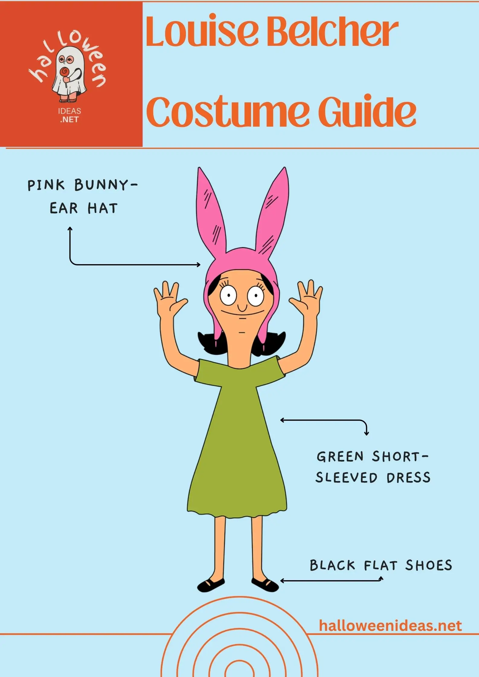 Louise Belcher: Pink bunny-ear hat, green short-sleeved dress, black flats. Add a devious grin and you’re ready to plot.