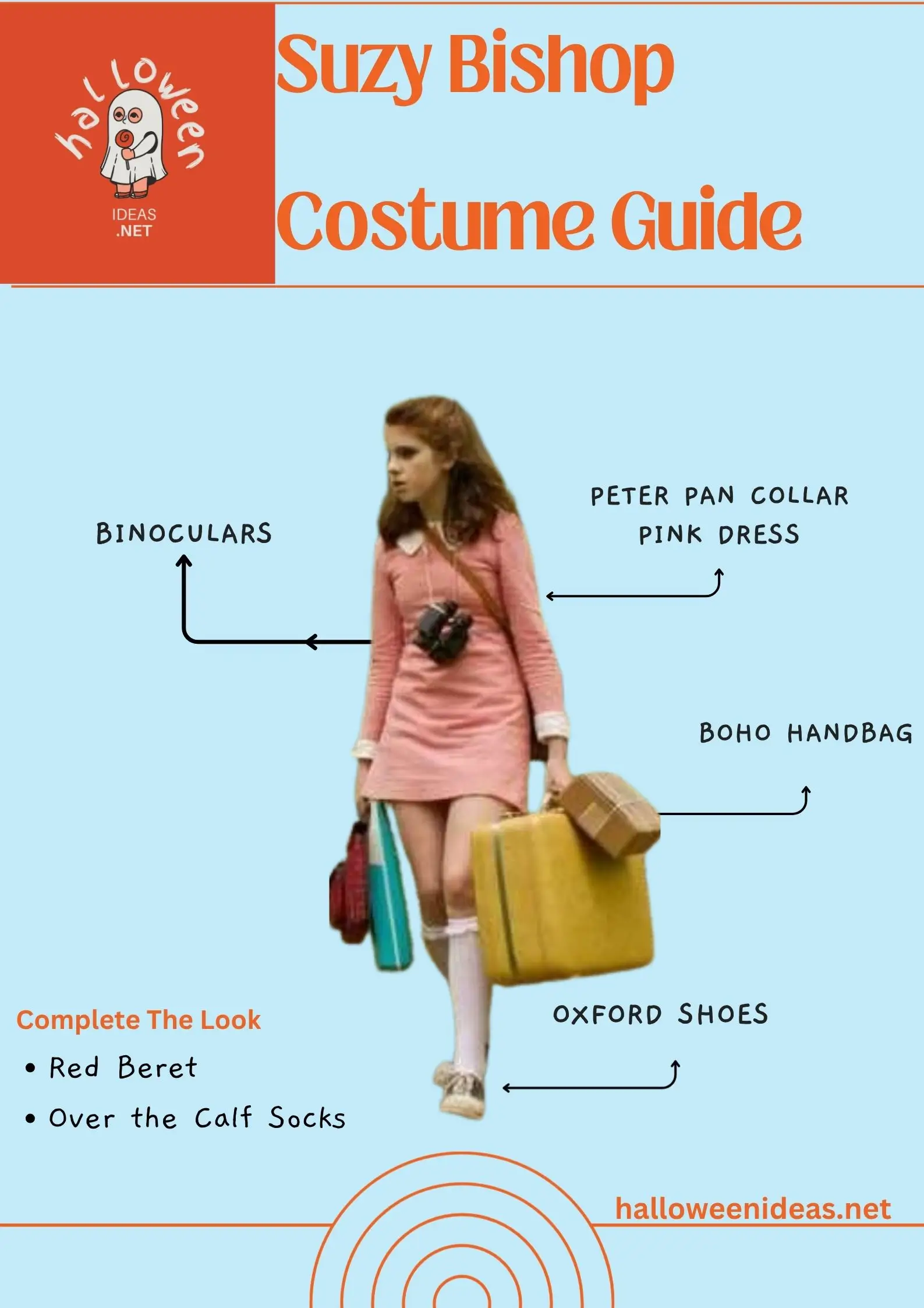Detail Precision: Choose a pink dress with a white Peter Pan collar for that unmistakable Suzy charm. A vintage-style handbag and binoculars hanging around the neck make the look instantly recognizable.